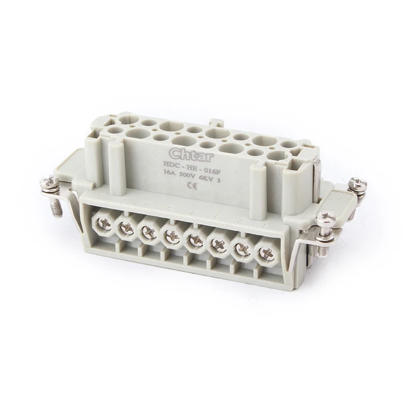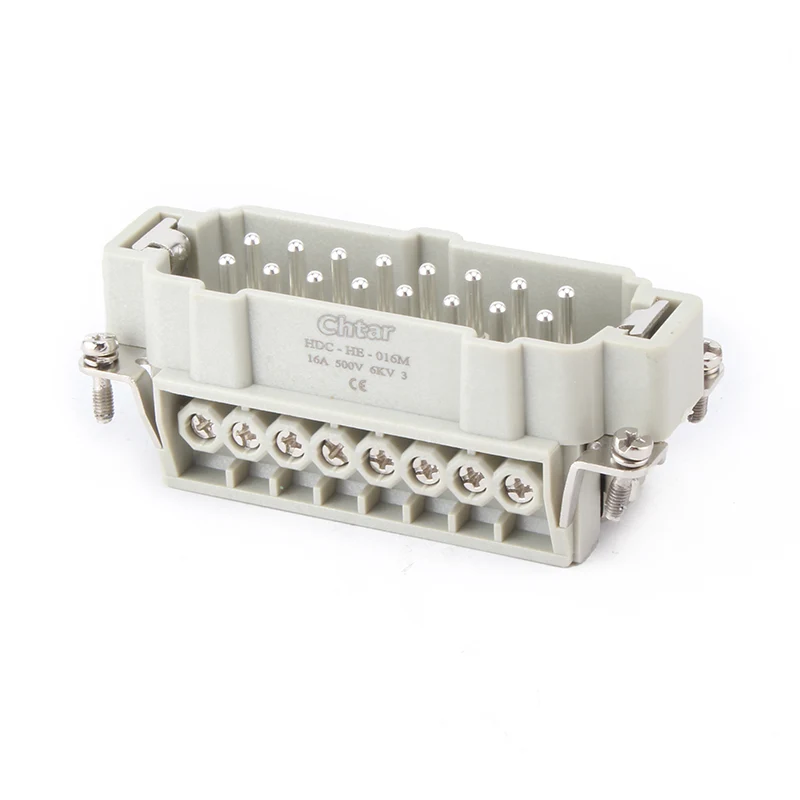 Is cónascaire tromshaothair breiseán 16A HE-016-F/M chun cinn CHTAR é cónascaire M/F 16 Insert Heavy Duty Connector. Tá páirteanna fireann agus baineann aige. Tá sé ag luí leis an cónascaire tromshaothair bhlaosc H16B. De ghnáth, cuirtear an chomhpháirt fireann le chéile sa tithíocht fireann, nó is féidir é a chur le chéile sa chomhpháirt baineann le haghaidh suiteáil droim ar ais de réir riachtanais an chustaiméara. Cinntíonn an t-ábhar cásála PC láidir agus na bioráin práis airgeadphlátáilte seoltacht agus buntáistí oibríochta an chónascaire tromshaothair plug-in M/F 16 bioráin.
